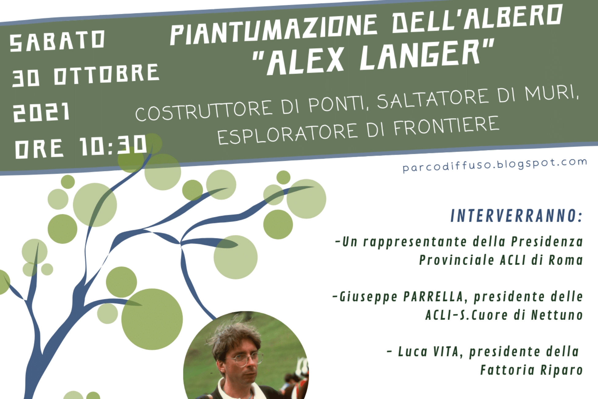 Si terrà nella mattinata di sabato 30 ottobre, a partire dalle ore 10:30, presso la Fattoria Riparo di Anzio il piccolo evento per la piantumazione di un albero di quercia, dedicato ad Alex Langer. L’appuntamento – organizzato in collaborazione con il circolo ACLI Sacro Cuore di Nettuno e le ACLI provinciali di Roma, con l’Ufficio diocesano per l’Ecumenismo e il Dialogo Interreligioso e con la Comunità Laudato Sì Castelli Romani – segnerà ufficialmente l’ingresso della struttura di Anzio all’interno del Parco diffuso “Eroi della Terra”.